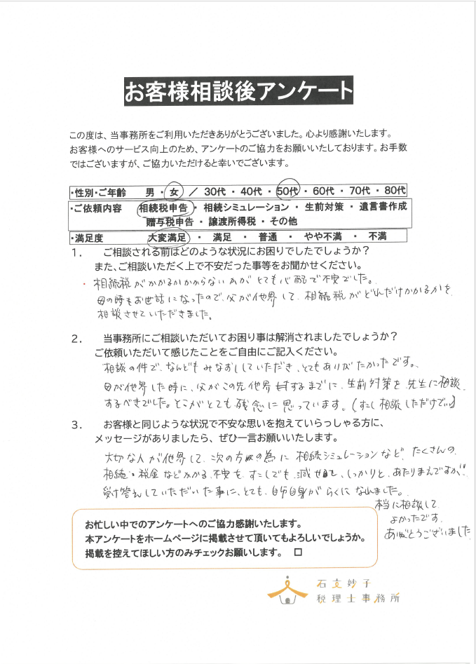母の時もお世話になったので、父が他界して相続税がどれだけかかるかを相談させていただきました。 -